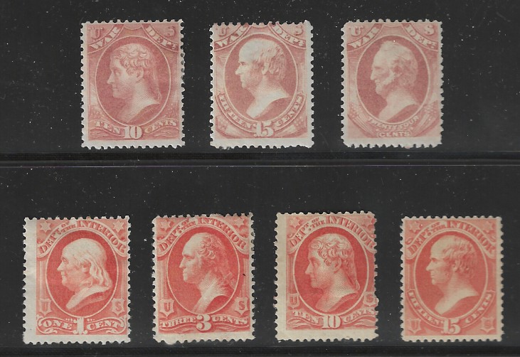 O88 // O102, 7 Diff. Stamps, 1873-79 Issues, Generally Sound Cond., Unused, OG, HR, Some Gum Dist., AVG-Fine, SCV is $1,130.00 (Image)