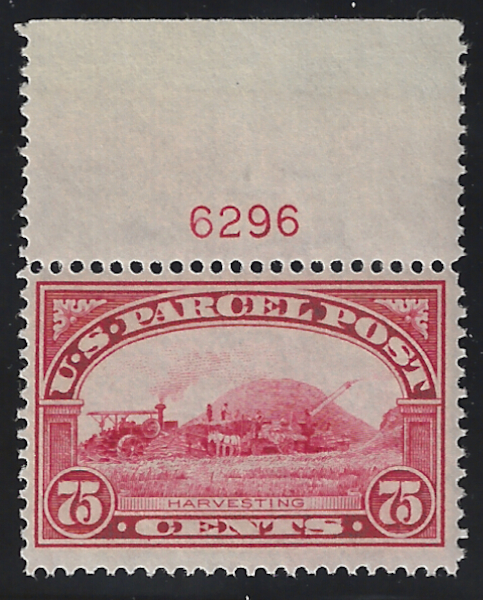 Q11 "75 c. Carmine Rose", Top Margin P# Single, 1913 Issue, Stamp is MNH, OG, VLH on Selvage, Sound Cond., F-VF, SCV is $190.00 (Stamp Single) (Image)