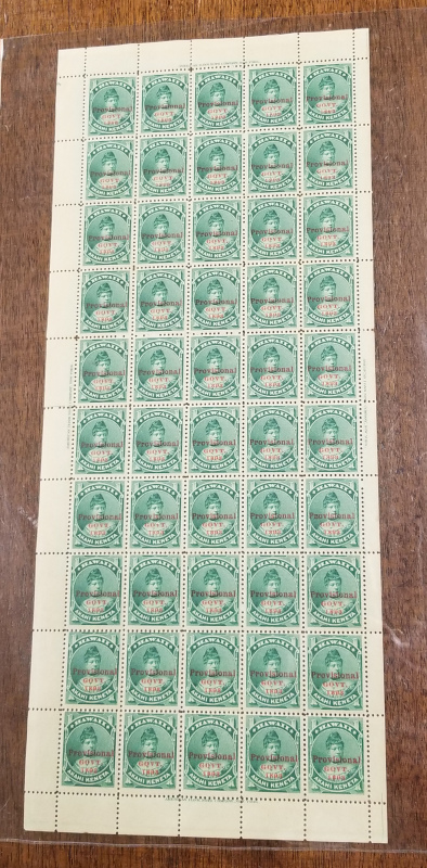 55 "1 c. Green," Provisional Govt. (1893 Issue), Cmpt. Pane of 50 Stamps, With "Amer. Bank Note Co." Imprint on All 4 Margins, MNH, OG, Few Minor Perf. Separations, Stamps are All Sound Cond., F-VF, SCV is $200.00 (for 50 MNH Singles) (Image)
