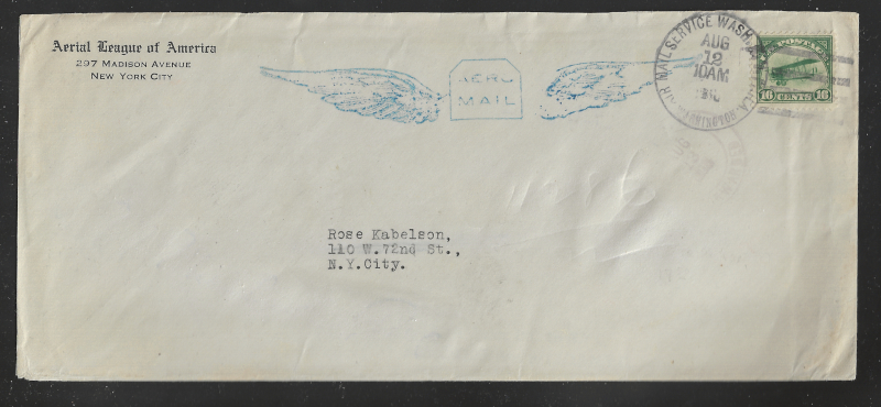 C1, C2, Two Diff. Airmail Flight Covers, #C1 with Jan. 7, 1919 Wash. D.C. Postmark (Sent to New York), AAMC #101, Sound Cond., Unopened, VF, Plus #C2 on "Aerial League of America" Business Envelope, With Wash. D.C. Cancel (Aug. 12, 1918) Sent to New York with Aug. 12, 1918 Backstamp, AAMC #107, Cover with some light Wrinkles, Neatly Opened at Left & Top, F-VF (Image)