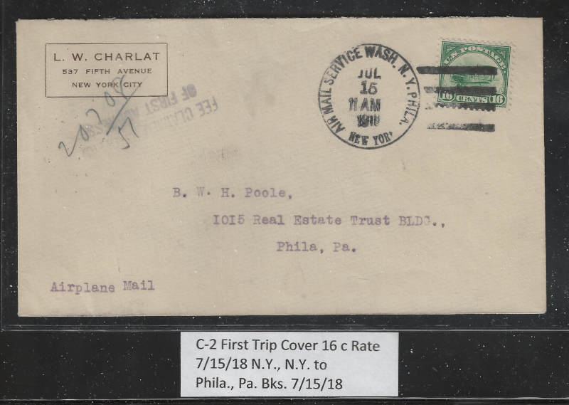 C2 "16 c. Jenny", First Flight Cover (July 15, 1918), New York, NY to Philadelphia, PA., With 7/15/18 Back Stamp, Neatly Opened at Top, Sound Cond., VF, SCV is $800.00 (Image)