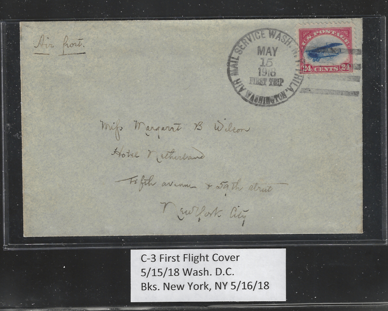 C3 "24 c. Jenny", First Flight Cover (May 15, 1918), Wash. D.C. to New York, NY, With 5/16/18 Back Stamp, Opened Neatly at Top, Sound Cond., VF, SCV is $750.00 (Image)
