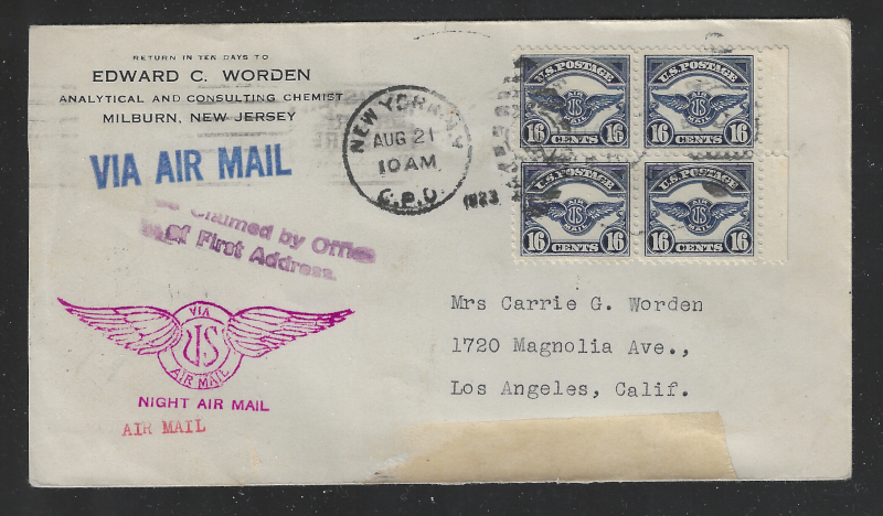 C5 Blk. of 4, Used, on Flight Cover from New York (Aug 21, 1923) to Los Angeles, With Aug. 22 (San Francisco) & Aug. 23 (Los Angeles) Back Stamps, Sound Cond., Neatly Opened at Left, Stamps are VF (Image)