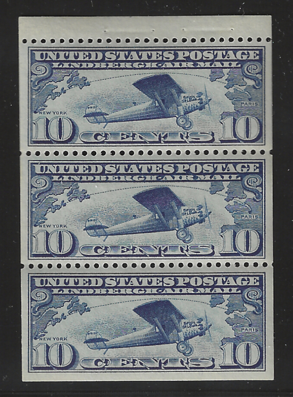C10a "10 c. Lindbergh", Bklt. Pane of 3, 1927 Issue, Sound Cond., Unused, OG, MNH, VF-XF for Item, SCV is $115.00 (for VF) (Image)