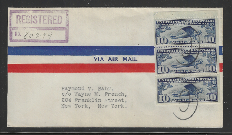 C10a First Day Cover, "10 c. Lindbergh" Bklt. Pane, Tied on Raymond Bahr Air Mail Envelope, With Washington D.C. and New York First Day Cancels (May 26, 1928) on Reverse, Neatly Opened at Left, Sound Cond., VF, SCV is $875.00 (Image)
