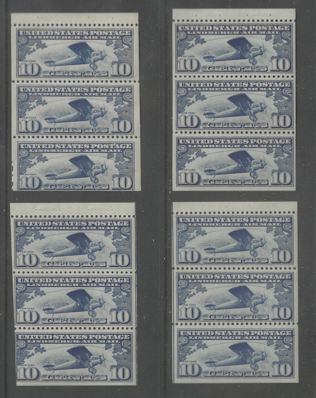 C10a (x 4), "10 c. Lindbergh", Bklt. Pane of 3, Four Diff. Positions (on the Press Sheet), 1927 Issue, Sound Cond., Unused, OG, MNH, Mostly F-VF, SCV is $460.00 (Image)