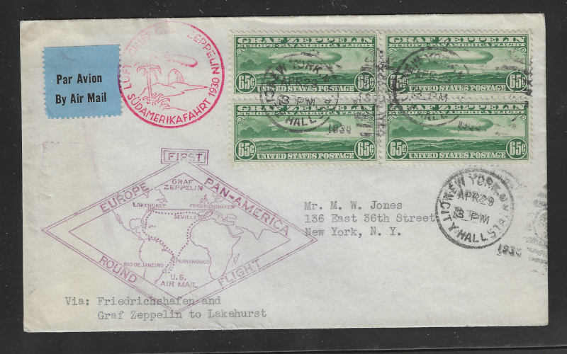 C13 "65 c. Green", Blk. of 4 on Cacheted Zeppelin Flight Cover (With Appropriate Cachets), Back Stamped April 29, 1930, Lakehurst N.J., Opened Neatly at Left, Sound Cond., VF, SCV for Used Stamps Only is $750.00 (Image)