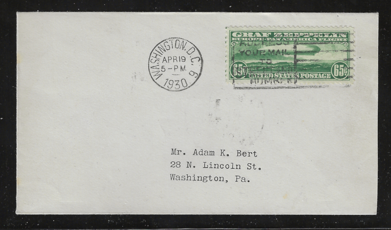 C13 "65 c. Zeppelin", First Day Cover (April 19, 1930), Adam Bert No Cachet Envelope, Sent from Washington, D.C. to Washington, PA, With Varick Street Station, NY Back Stamp, Neatly Opened at Right, Sound Cond., Stamp is VF, Cat. Value is $1,000.00 (Brookman) (Image)