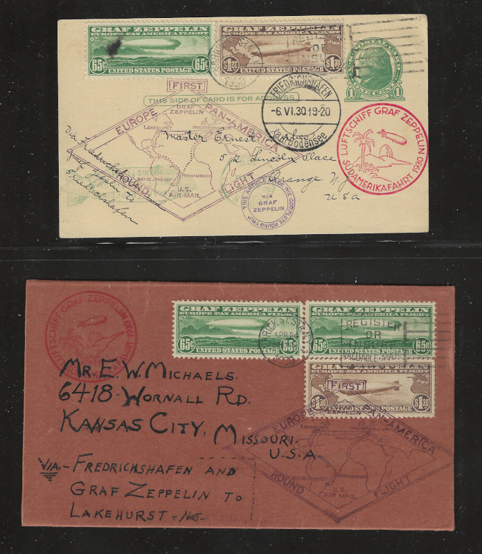 C13, C14, Two Diff. "Graf Zeppelin" Flown Items, Round Trip Postal Card (With C13 + C14) to Orange, N.J., Plus Round Trip Cover (with C13 (x 2) + C14) to Kansas City, MO, Both with Appropriate Cachets, Sound Cond., Stamps are VF, SCV is $1200.00 (for Used Stamps Only) (Image)