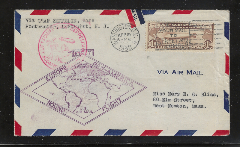 C14 "$1.30 Zeppelin", First Day Cover (April 19, 1930), Sent from Washington, D.C. to West Newton, Mass., With Appropriate Cachets, Includes Friedrichshafen, Boston & West Newton Back Stamps, Neatly Opened at Top, Sound Cond., Stamp is VF, Cat Value is $2,750.00 (Brookman) (Image)