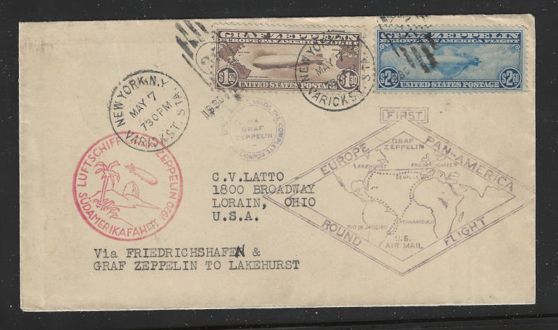 C14, C15, On Single "Zeppelin" Flown Cover, Cmpt. Round Trip (May 7, 1930), Varick Street Station, NY to Lorain, Ohio (Via Friedrichshafen & Lakehurst), With Appropriate Cachets, June 18, 1930 Back Stamp, Neatly Opened at Right, Sound Cond., Stamps are VF-XF, SCV is About $1200.00 (Image)