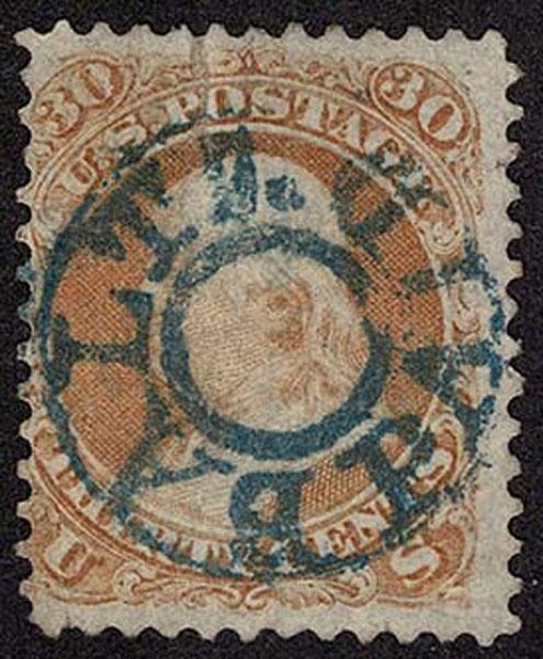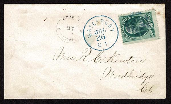 The Crowe Census has only four recorded examples of the blue Waterbury cancellation, all used between July 26 and July 28, 1875. This is the EARLIEST RECORDED EXAMPLE. Sale and Lot Updates Suggested Bid $500-750 (Image)