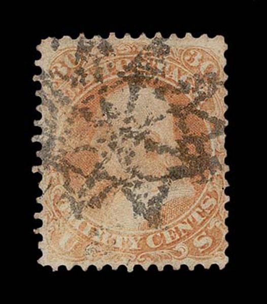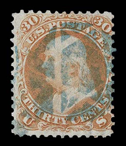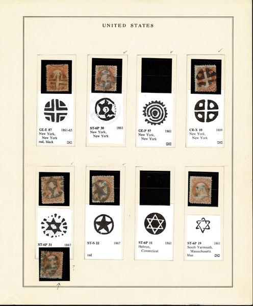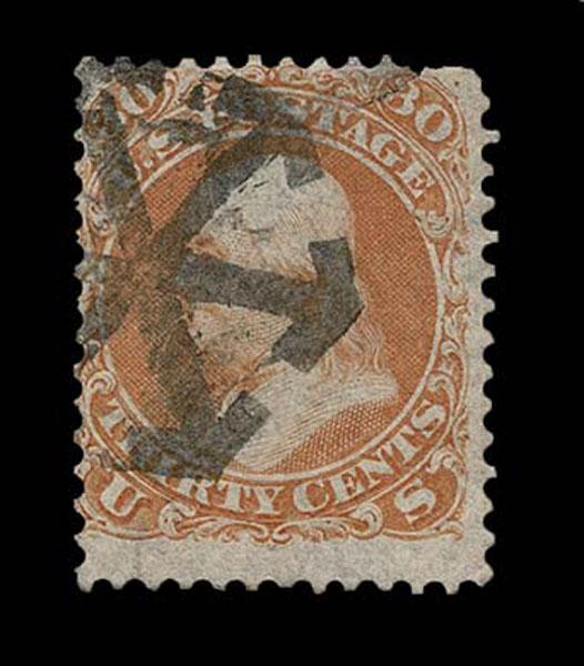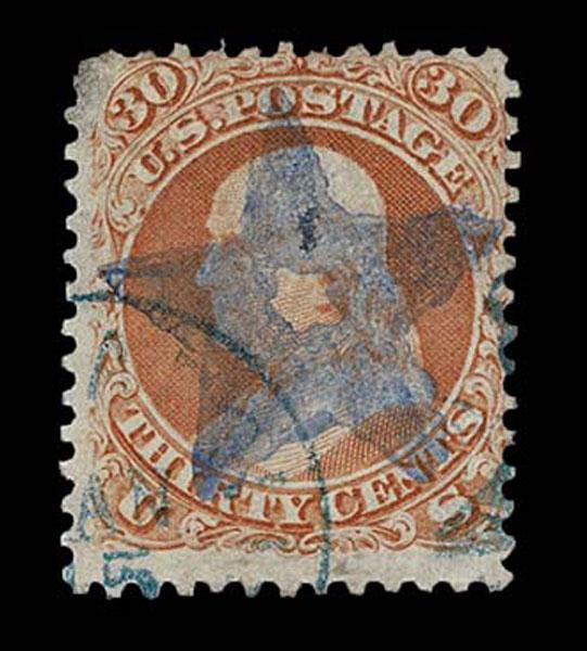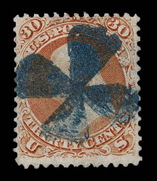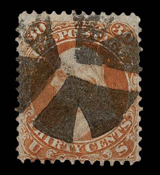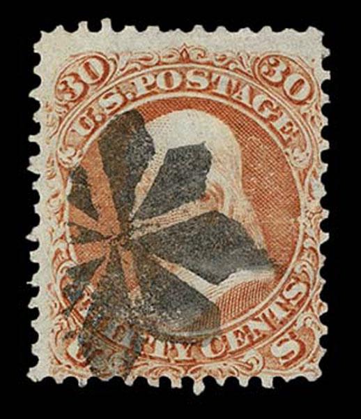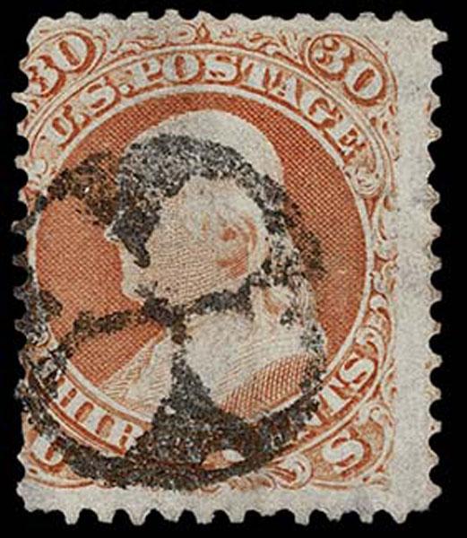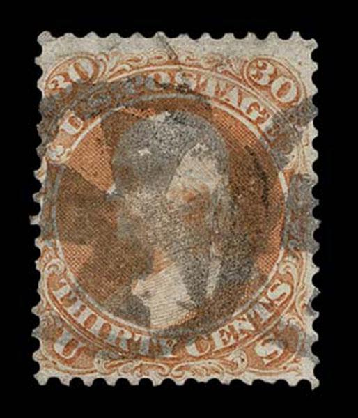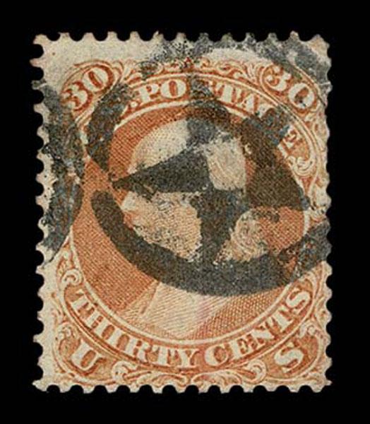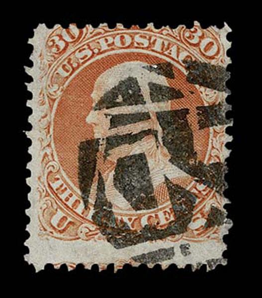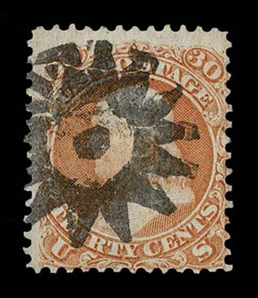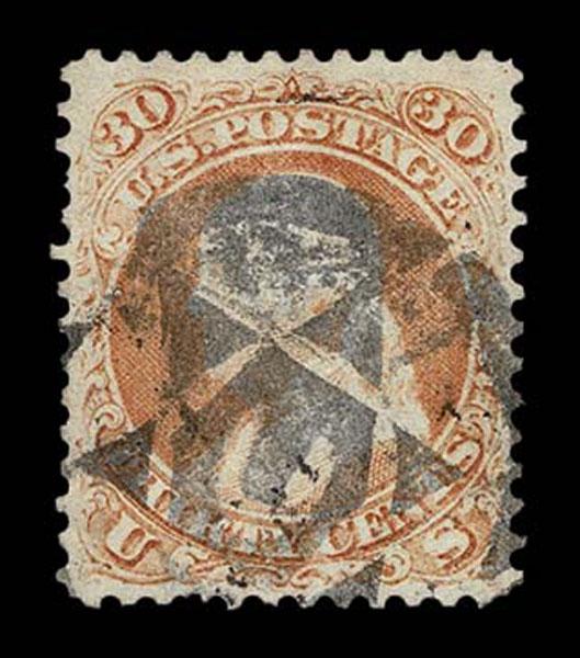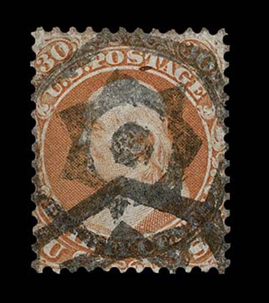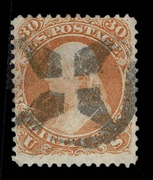 UNITED STATES: Fancy Cancels: 1861 - 1862; 30c orange 55 stamps, a varied assortment of Stars, Crossroads, Segmented, Grids, Cogwheels, Paids, colors etc. on a stamp far rarer than the normal 3c local usages, condition can vary but the assortment is impressive. The remainder of the specialized section in this catalogue. Stamps alone catalog $13,750 without premium for cancels.