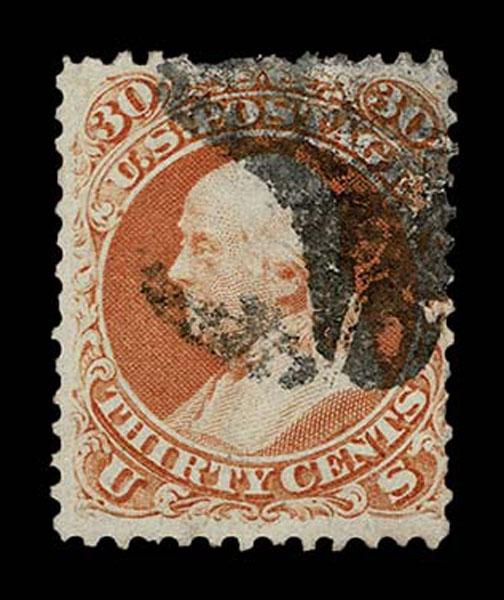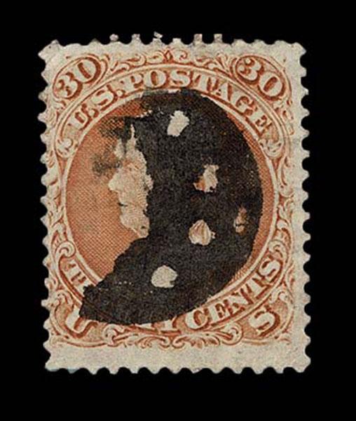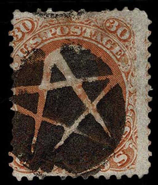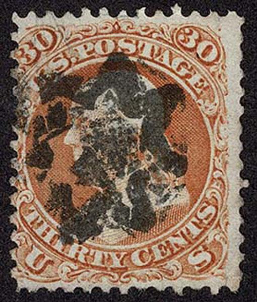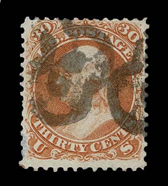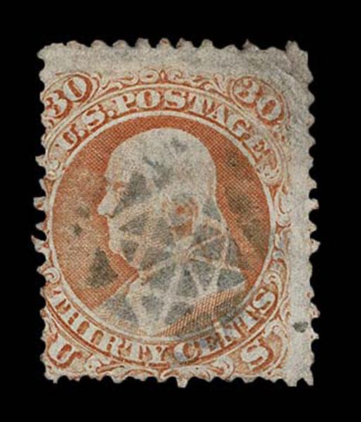 UNITED STATES: 1861 30c orange, black New York Foreign Mail "Five Point Star inside Circle" cancellation, perforation faults, bold strike. Crowe Cert.(2025). (Kirke 64-01-25 SGEO Sale and Lot Updates Suggested Bid $125-150 (Image)