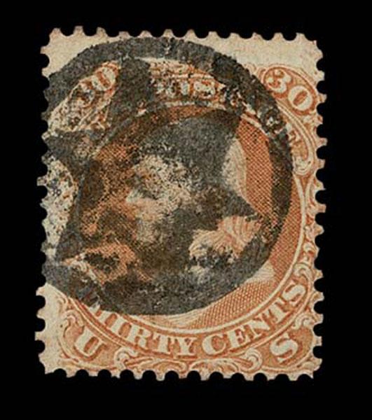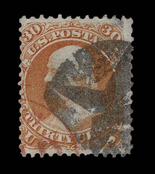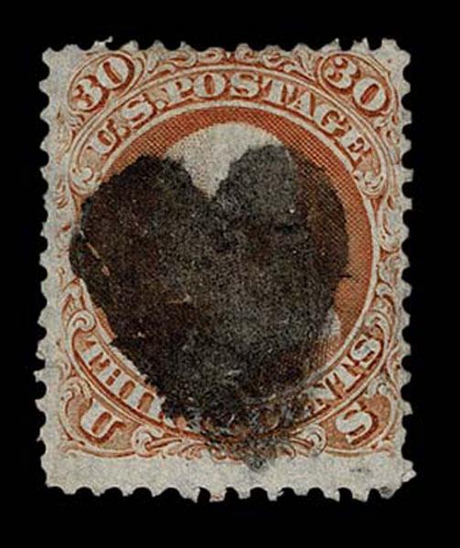 UNITED STATES: 1861 30c orange, black New York Foreign Mail "Solid Heart" cancellation, vertical crease, nicely centered. Crowe Cert.(2025) (type of Kirke 73-07-24 PIC),(Skinner-Eno PH-H11), (Weiss RE-55), Cole NYFM 67) Sale and Lot Updates Suggested Bid $125-150 (Image)