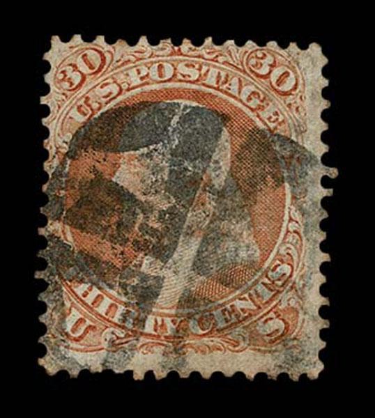 UNITED STATES: 1861 30c orange, used with Hebron CT "Negative Star if David" cancellation, thin and small piece off top well clear of cancel. Crowe Cert.(2025). (type of Skinner-Eno CT-GP 11) Sale and Lot Updates Suggested Bid $150-200 (Image)