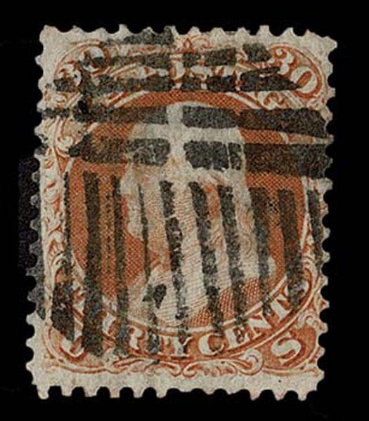 The "30c" Fancy Cancel Collection.UNITED STATES: 1861 30c orange with black New York Foreign Mail Geometric cancellation, scissor separated perforations all around. Crowe Cert.(2025). (Kirke 63-04-12 SGEO)(Skinner Type NYFM63-2) Sale and Lot Updates Suggested Bid $100-125 (Image)