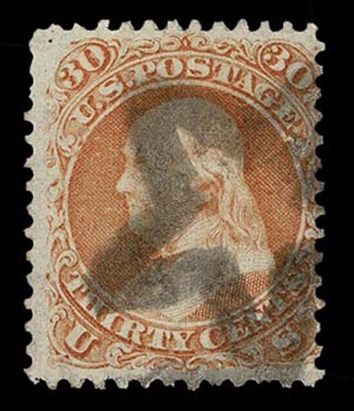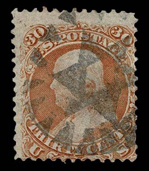 UNITED STATES: 1861 30c orange, used with black New York City Five Point Star with negative letter "U" inside circle cancellation, few faults. Crowe Cert.(2025). (type of Skinner-Eno ST-C 21) Sale and Lot Updates Suggested Bid $100-125 (Image)