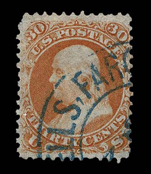 UNITED STATES: 1868 30c orange "F" Grill, used with black San Francisco fancy 8 Point Star cancellation. tiny thin. Stamp alone catalogues $1,000. Crowe Cert.(2025). (type of Skinner-Eno ST-8P-3) Sale and Lot Updates Suggested Bid $200-250 (Image)