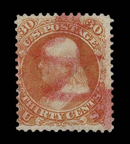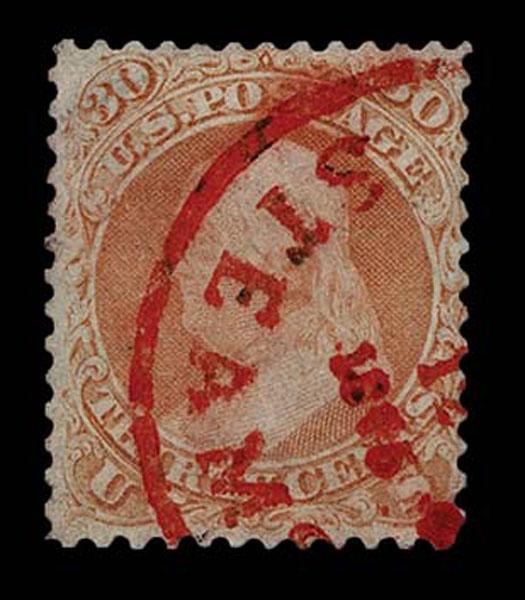 UNITED STATES: 1861 30c orange with "STEAMER … 1865" cancellation in a mixture of red and black inks. brilliant. Crowe Cert.(2025).