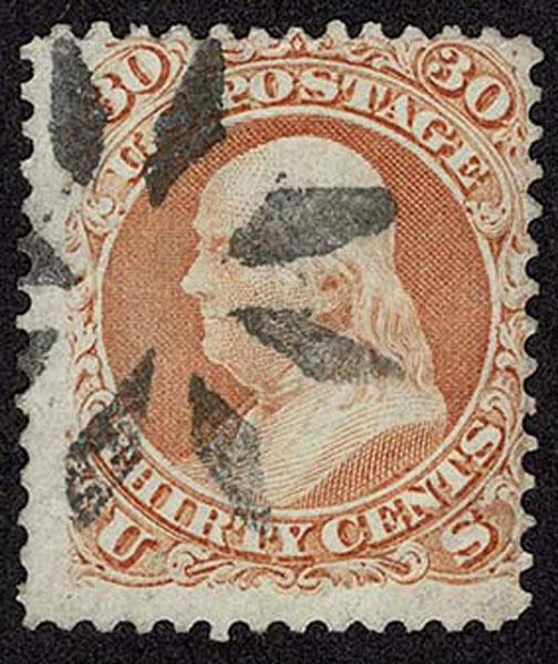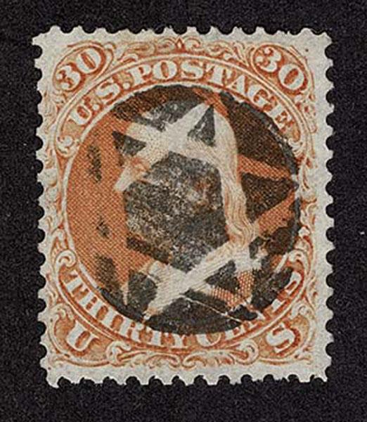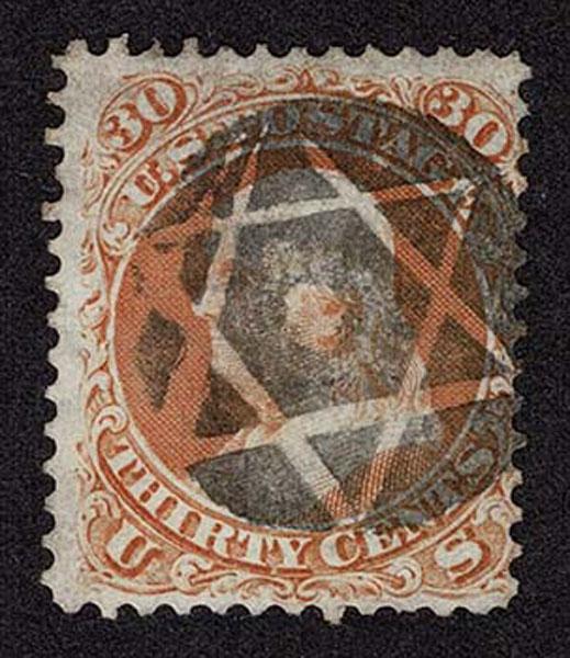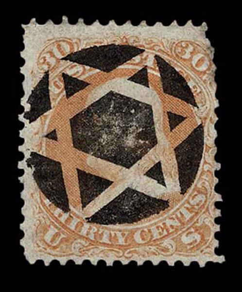UNITED STATES: 1861 30c orange, used with crisp black negative New Haven CT "Star of David" cancellation, good placement. Crowe Cert.(2025). (type of Skinner-Eno ST-6P 34) Sale and Lot Updates Suggested Bid $150-200 (Image)