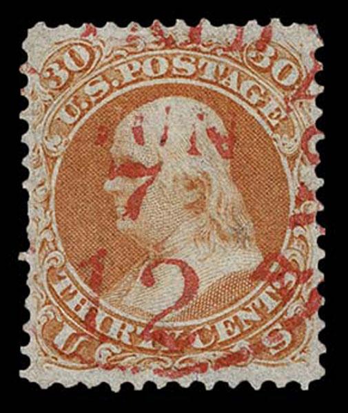 UNITED STATES: 1861 30c orange, used with red "New York 12" exchange marking cancellation, stamp is well centered ,few faults. Crowe Cert.(2025).