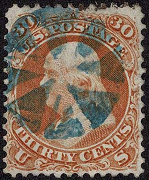 UNITED STATES: 1861 30c orange, used with blue "Circle of Wedges", cancellation well placed. Crowe Cert.(2025).