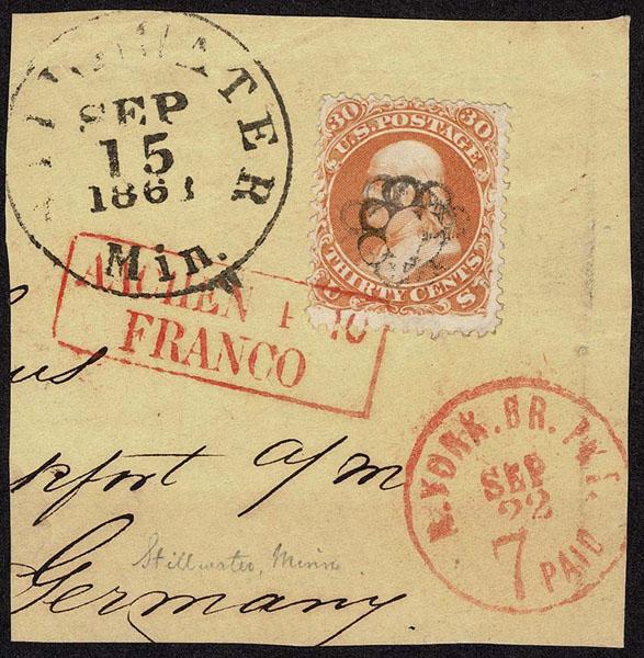 UNITED STATES: 1861 30c orange with Stillwater Min black "Rain of Circles", tied on piece with SEP 15 1863 c.d.s. also red AACHEN transit and NY BR PKT 7 PAID handstamp. Very cute. (Skinner-Eno GE-C 4) Sale and Lot Updates Suggested Bid $100-150 (Image)