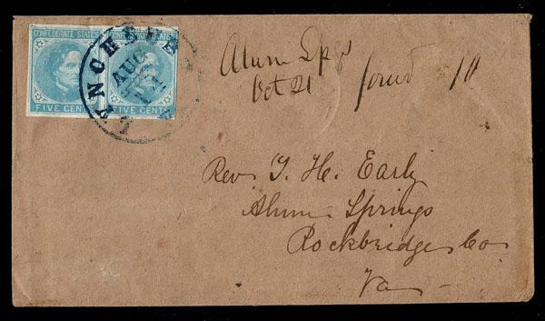 Revenues.UNITED STATES: Confederate State, 1862 5c light blue PAIRS on each face of "Turned Cover": both margins all around and tied respectively by black grid cancels with FARMVILLE AUG c.d.s. and blue LYNCHBURG AUG 14 VA c.d.s. with manuscript "forward 10 Oct 21" to Rickbridge. (6) Sale and Lot Updates Suggested Bid $150-200 (Image)