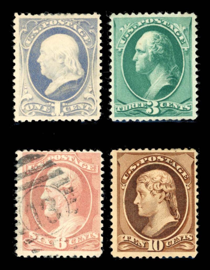 UNITED STATES 1881-1882 #206-09 STAMPS F-VF */O. Selection of 4 stamps with designs of 1873 stamps re-engraved. #206* 1c Franklin, 207* 3c Washington, 208/o 6c Lincoln and 209* 10c Jefferson. Condition is nice. Scott $630.00 CAD. (Image1)