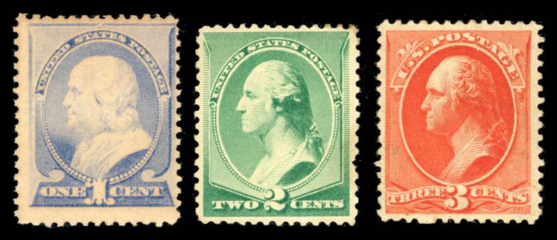 UNITED STATES 1887 #212-14 STAMPS F */**. Selection of 3 stamps, #212** 1c Franklin, #213** 2c Jackson (missing perf. at right) and #214* 3c Washington. Condition is nice. Scott $660.00 CAD. (Image1)
