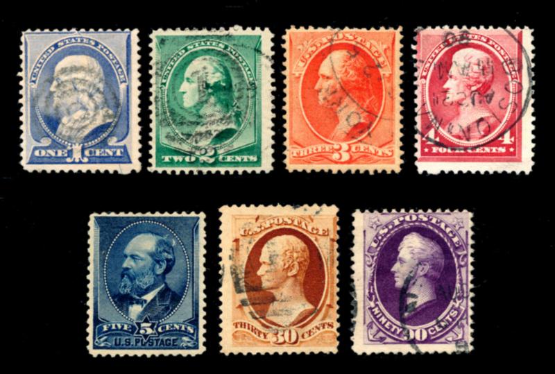 UNITED STATES 1887-1888 #212-18 STAMPS F */O. Complete set of 7 stamps, 6 used and 1 mint hinged (5c James A Garfield). Scott $850.00 CAD. (Image1)
