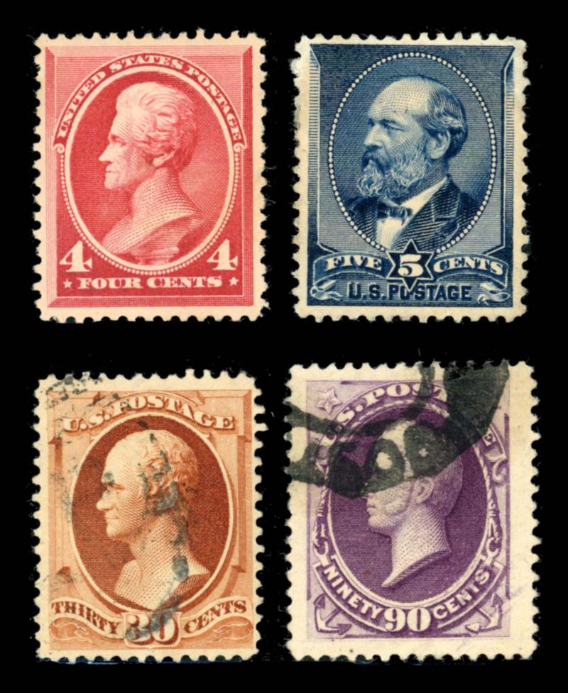 UNITED STATES 1888 #215-18 STAMPS F-VF */O. Selection of 4 stamps, #215* 4c Jackson, #216* (gum disturbed) 5c James A Garfield, #217/o Alexander Hamilton and #218/o 90c Perry. Condition is nice. Scott $1000.00 CAD. (Image1)