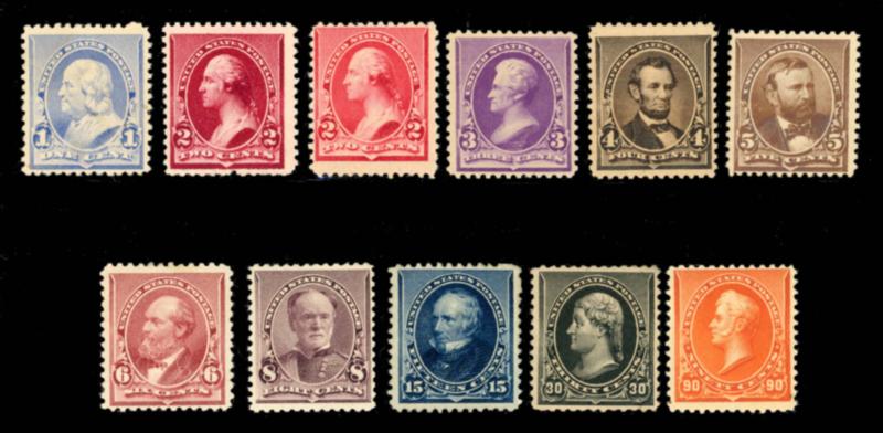 UNITED STATES 1890-1893 #219/29 STAMPS F-VF */**. Short set of 11 stamps, missing to complete the set is #226. Numbers 219-20 and 222-23 are never hinged and number 227 is without gum. Condition is nice. Scott $2600.00 CAD. (Image1)