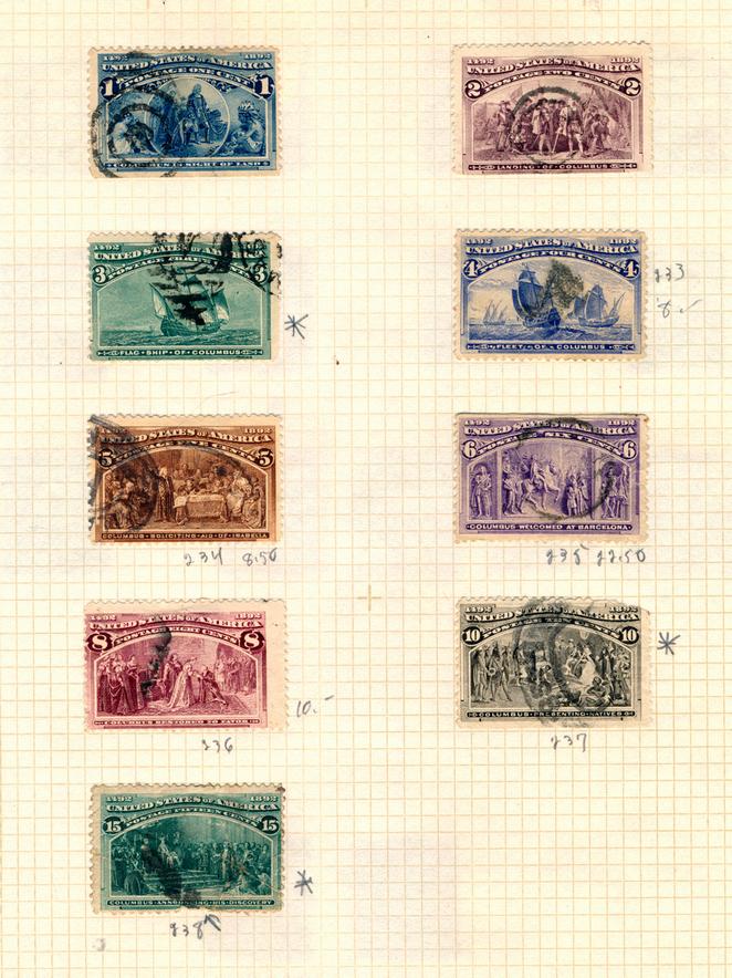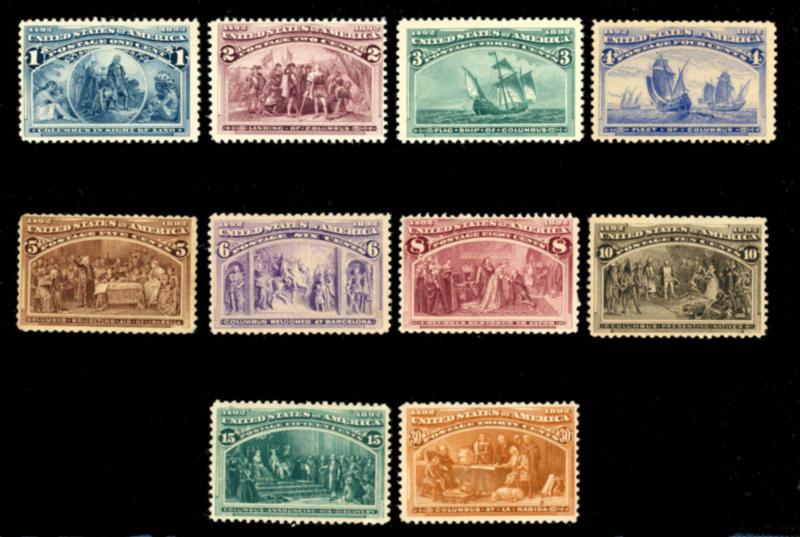 UNITED STATES 1893 #230-39 STAMPS F */**. Columbian Exposition issue, selection of 10 mint stamps. Numbers 230 to 233 (1c to 4c) and 236 (8c) are never hinged. Scott $1580.00. (Image1)