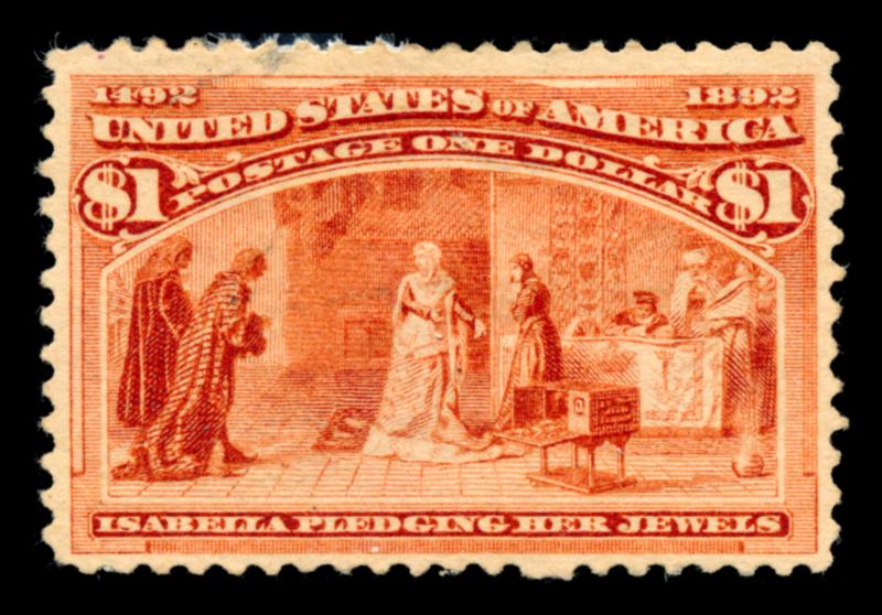 UNITED STATES 1893 #241 STAMP VG *. One dollar stamp from the Columbian Exposition issue. The stamps are mint and thinned at top middle in margin. Scott $1380.00 CAD. (Image1)