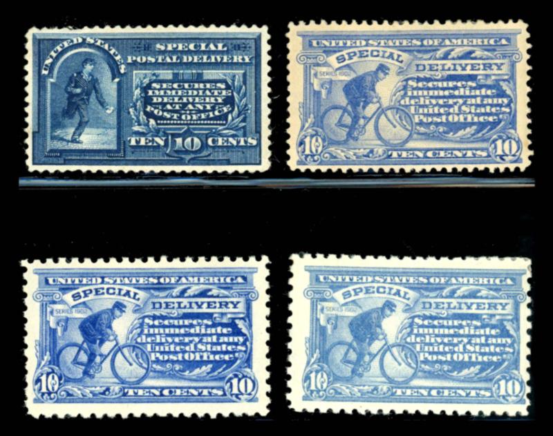 UNITED STATES 1895-1916 #E5/10 STAMPS F *. Selection of 4 Special Delivery mint hinged stamps. Numbers are E5-E6 (Perf.12 Wmk 191), E9 (Perf.10 Wmk 190) and E10 (Perf.10 Unwmk). Scott $1380.00 CAD. (Image1)