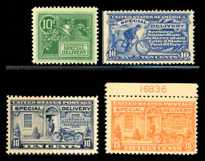 UNITED STATES 1908-1925 #E7/13 STAMPS F-VF **. Selection of 4 Special Delivery mint never hinged stamps. Numbers are E7 (Perf.12 Wmk 191), E8 (Perf.12 Wmk 190) and E12-13 (Perf.11 Unwmk). Scott $780.00 CAD. (Image1)