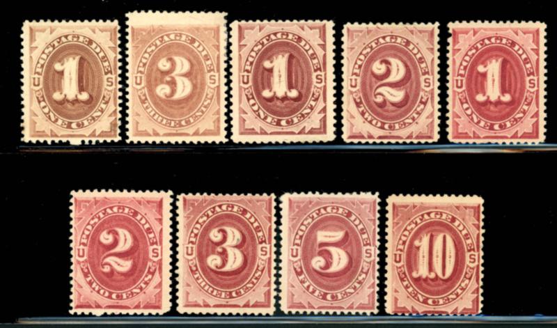 UNITED STATES 1879-1891 #J1/26 STAMPS F-VF */**. Selection of 9 Postage Due mint stamps printed by the American Bank Note Co. Numbers are J1*, J3*, J15**, J16*, J22-26*. Scott $1200.00 CAD. (Image1)