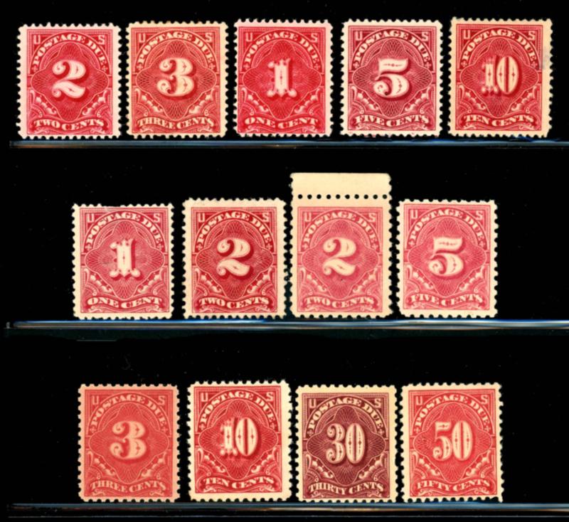 UNITED STATES 1894-1916 #J32/67 STAMPS F-VF */**. Selection of 13 Postage Due mint stamps printed by the Bureau of Engraving and Printing. Numbers are J32-33*, J38*, J41-42*, J45-46*, J53*, J55*, J63**, J65**, J66-67*. Scott $1400.00 CAD. (Image1)