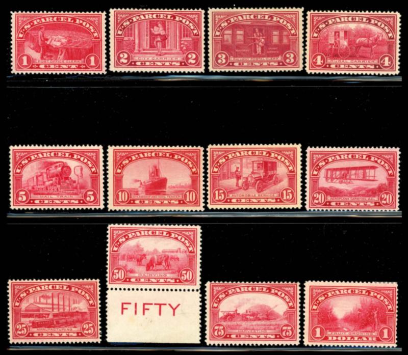 UNITED STATES 1913 #Q1-12 STAMPS F-VF */**. Complete set of 12 mint Parcel Post stamps. Numbers Q1, Q4, Q6 et Q10 (bottom margin with inscription) are never hinged. Scott $1800.00 CAD. (Image1)