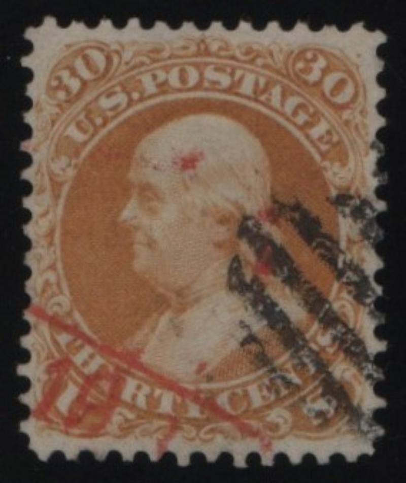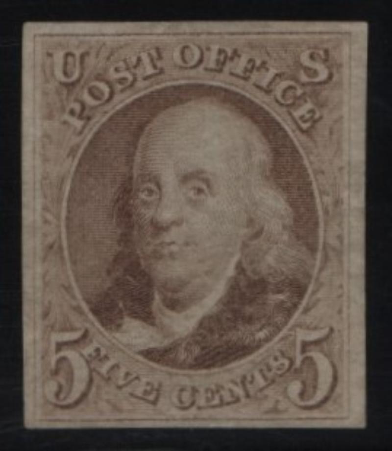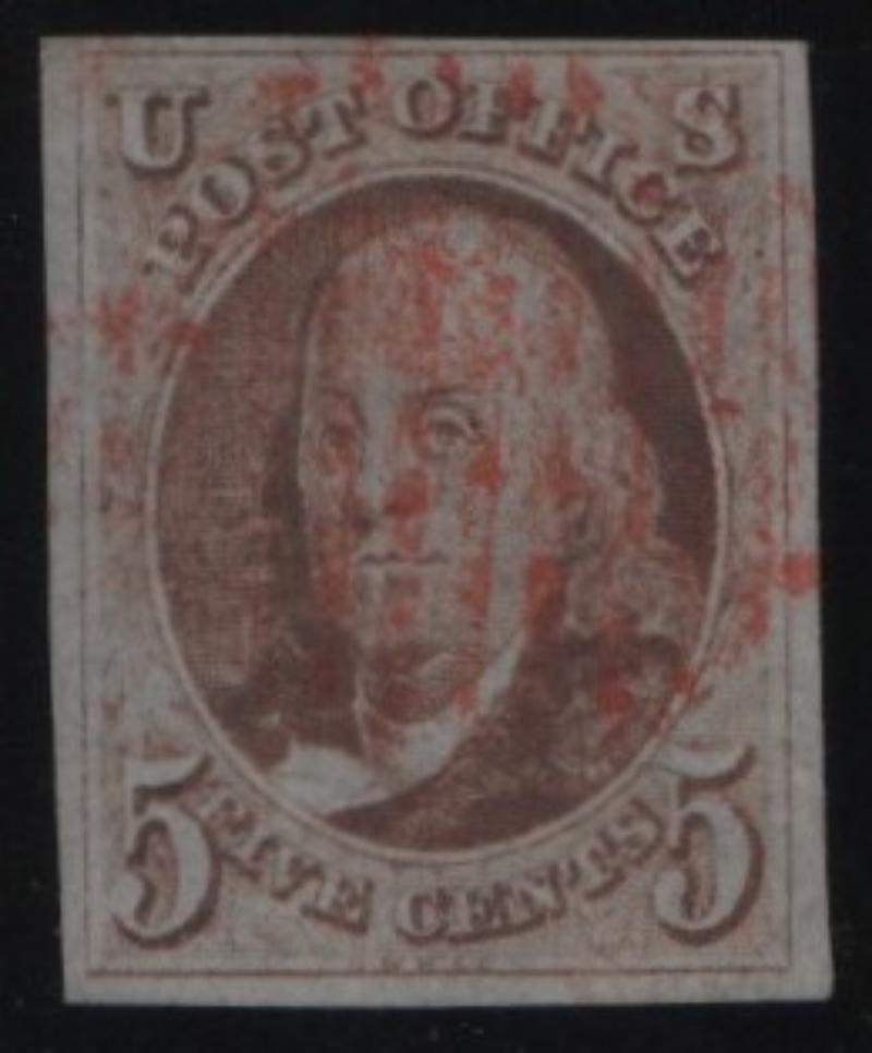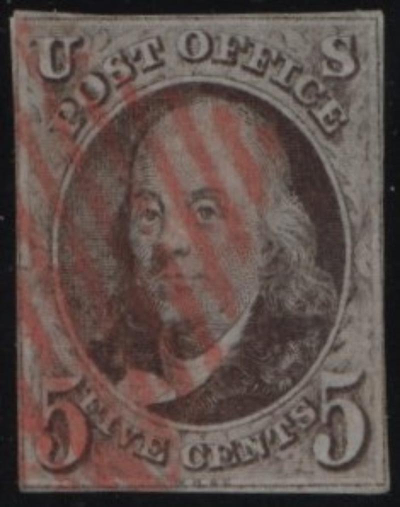 1 F-VF 5¢ Franklin, red grid cancel, just touches at right (Image)