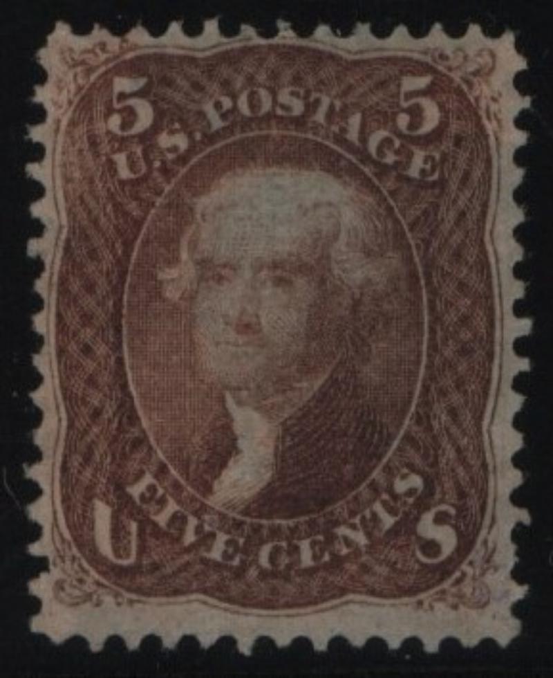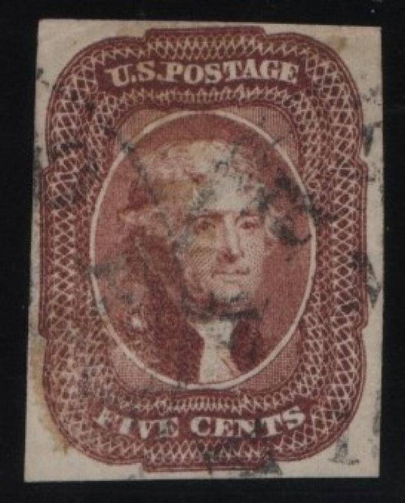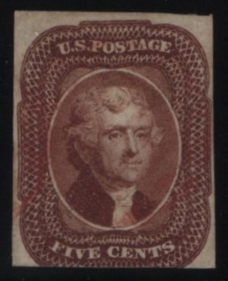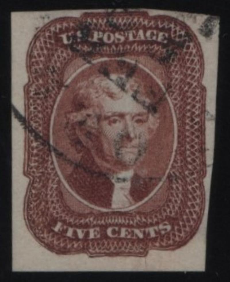 12 VF 5¢ red brown Jefferson imperf, on bright white paper, cds cancel (Image)