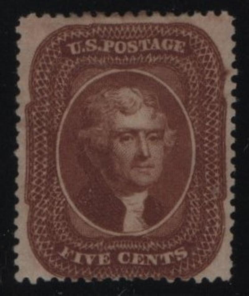30 F-VF NG, 5¢ orange brown Jefferson, three large margins to in at bottom (Image)