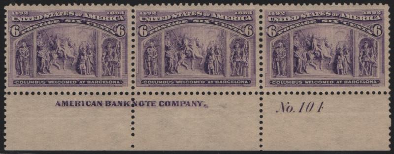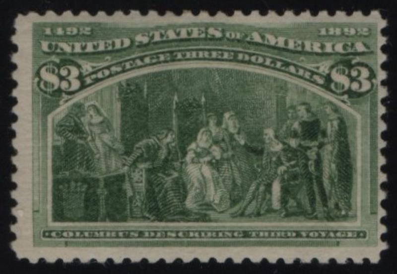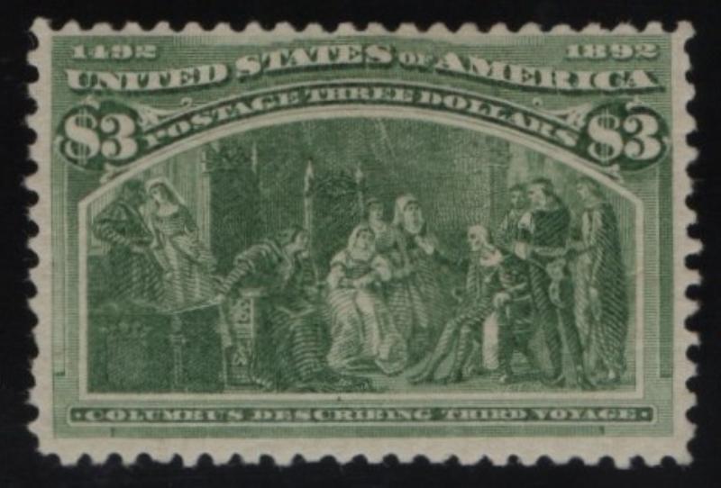 243 F-VF HR, $3 yellow green Columbian, small thin spot, rich color (Image)