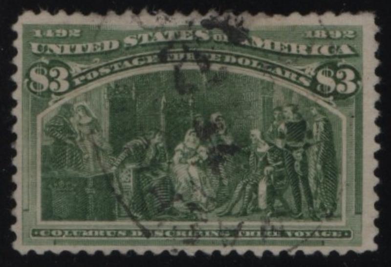 243 F-VF $3 yellow green Columbian, light town cancel (Image)