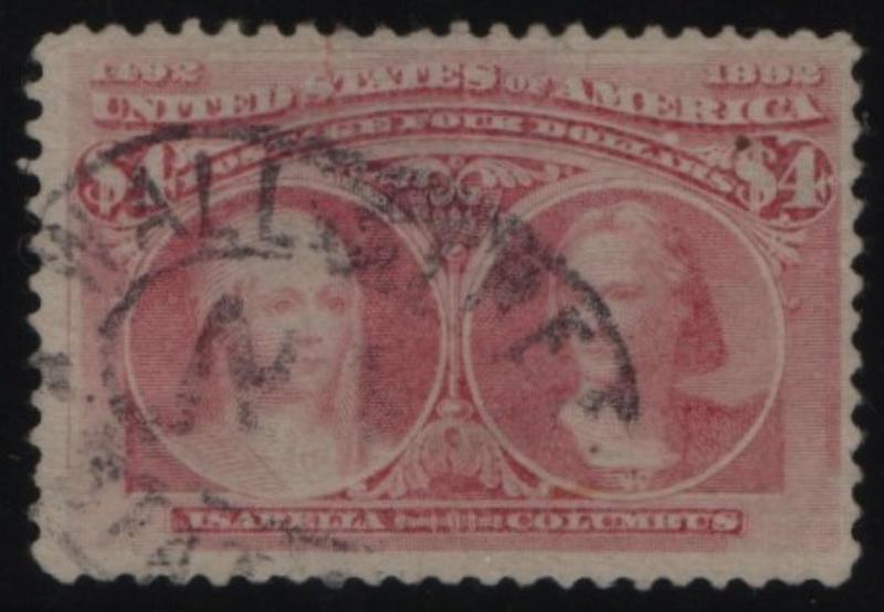 244a F-VF $4 rose carmine Columbian, thin spot, Wall St Station cancel (Image)