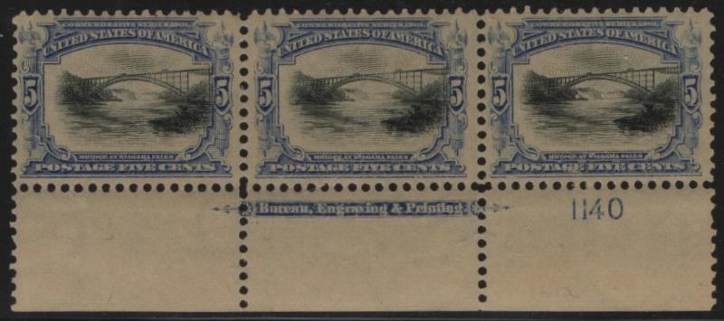 297 F-VF+ HH, Plate # Strip/3, 5¢ ultramarine & black Pan-Am, bottom pl# 1140 (Image)