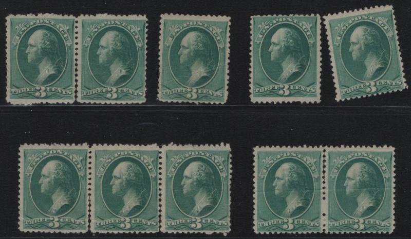 207 (16) F-VF to VF, NH, 3¢ blue green Re-engraved, all w/ creases (Image)