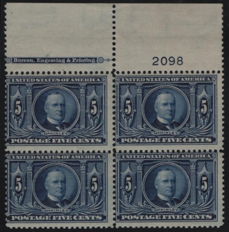 326 F NH, Plate Block/4, 5¢ dark blue McKinley, top pl# 2098 w/ impt (Image)